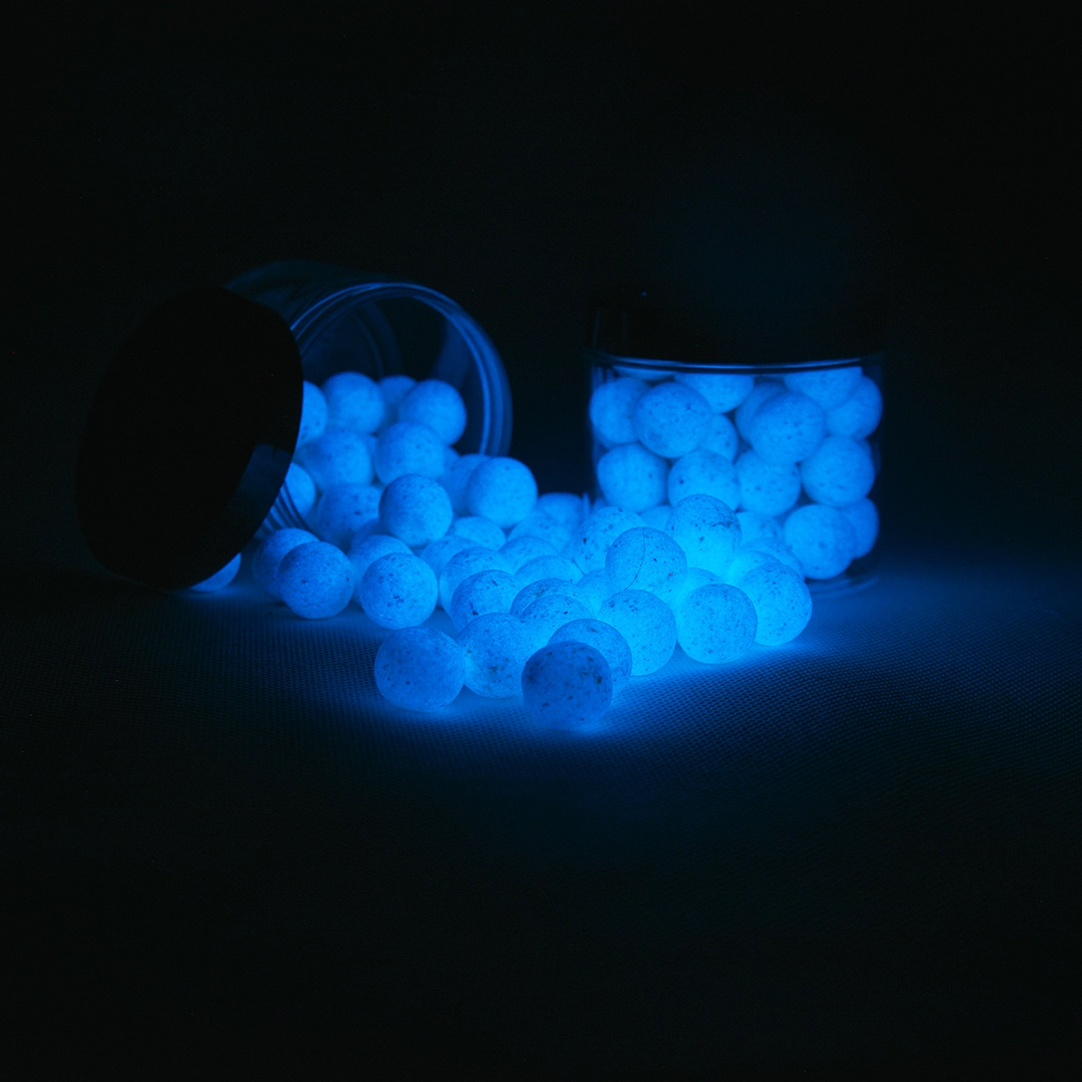 💡 Luminiscenčné plávajúce boilies – počas dňa sa „nabijú“ svetlom, v tme potom svietia jemnou modrou žiarou.